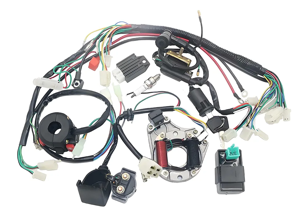 فكر في هذا باعتباره عقل وأعصاب دراجتك النارية - التعامل مع الطاقة والشرارة والأضواء وجميع معلوماتك الحيوية. يبدأ تشغيله بالبطارية والجزء الثابت (أو المغناطيس في الرحلات القديمة) ومحرك التشغيل الذي يعمل على دوران الأشياء. يعتمد الإشعال على أجزاء مثل شمعة الإشعال والموزع (على الدراجات القديمة). جميع إضاءة LED (المصابيح الأمامية، وإشارات الانعطاف)، والبوق، وعداد السرعة، ومقياس سرعة الدوران، وعداد المسافات الذي يتتبع الأميال التي قطعتها. تهمس المستشعرات والمرحلات المهمة في الدماغ، بينما تلتف مجموعة الأسلاك عبر الإطار الذي يربط كل شيء. إذا كان يحتاج إلى فولتات، أو يصدر ضوءًا، أو يخلق شرارة، أو يعرض لك بيانات، فهو متصل بهذا النظام.